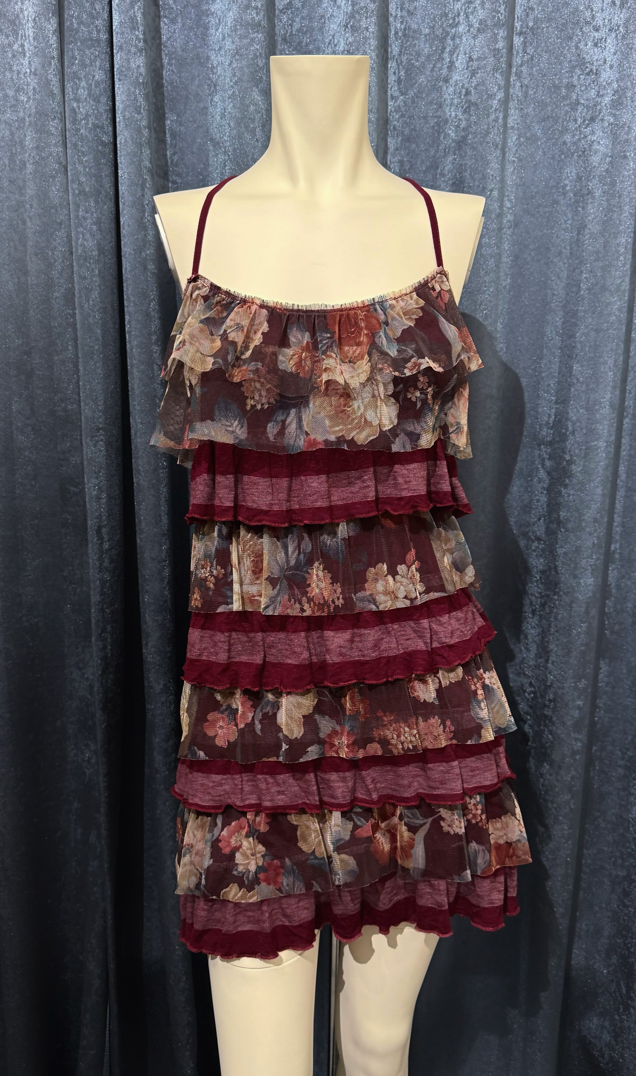 [Spain] Burgundy Floral Tiered Sheer Mini Dress