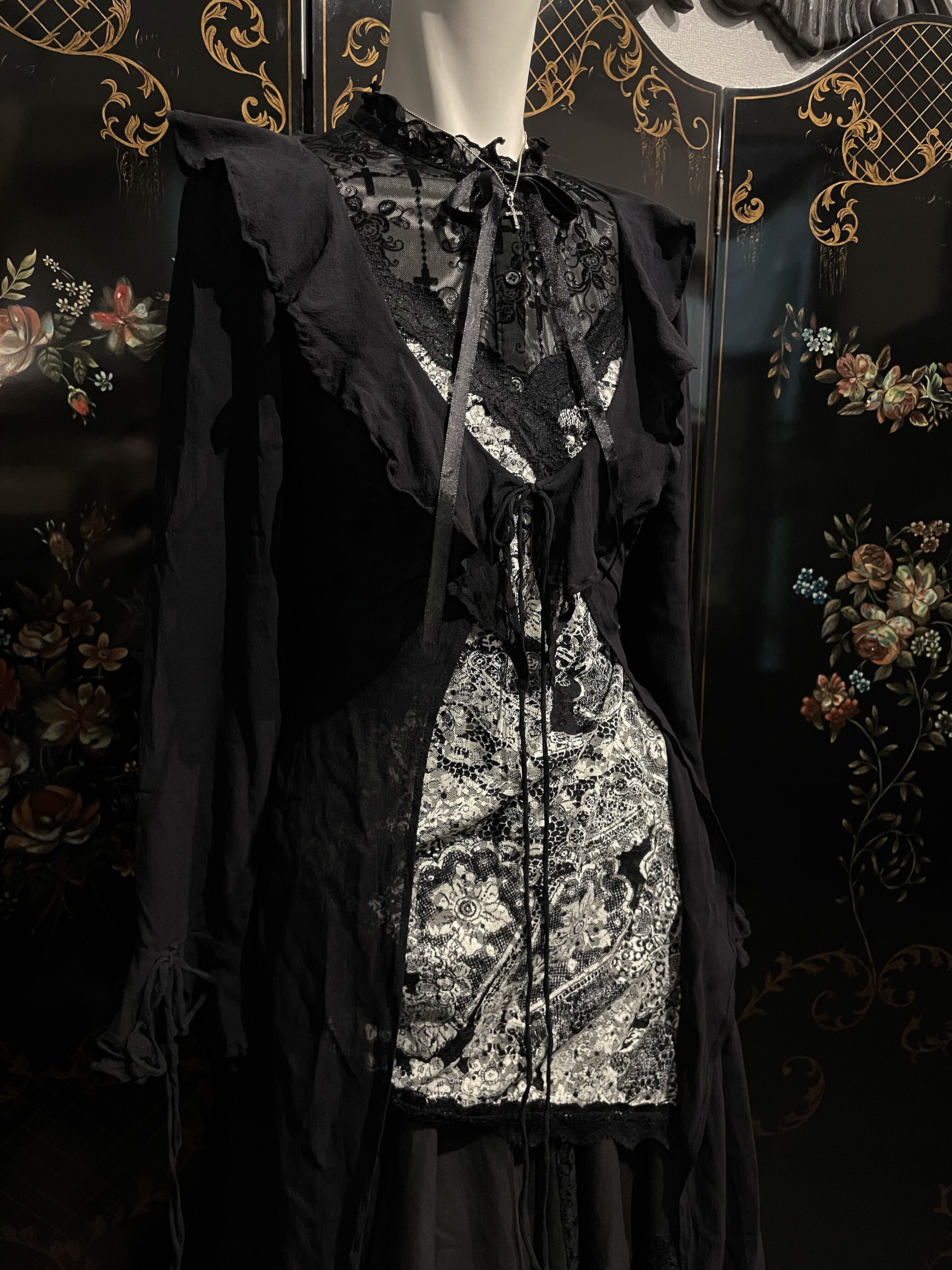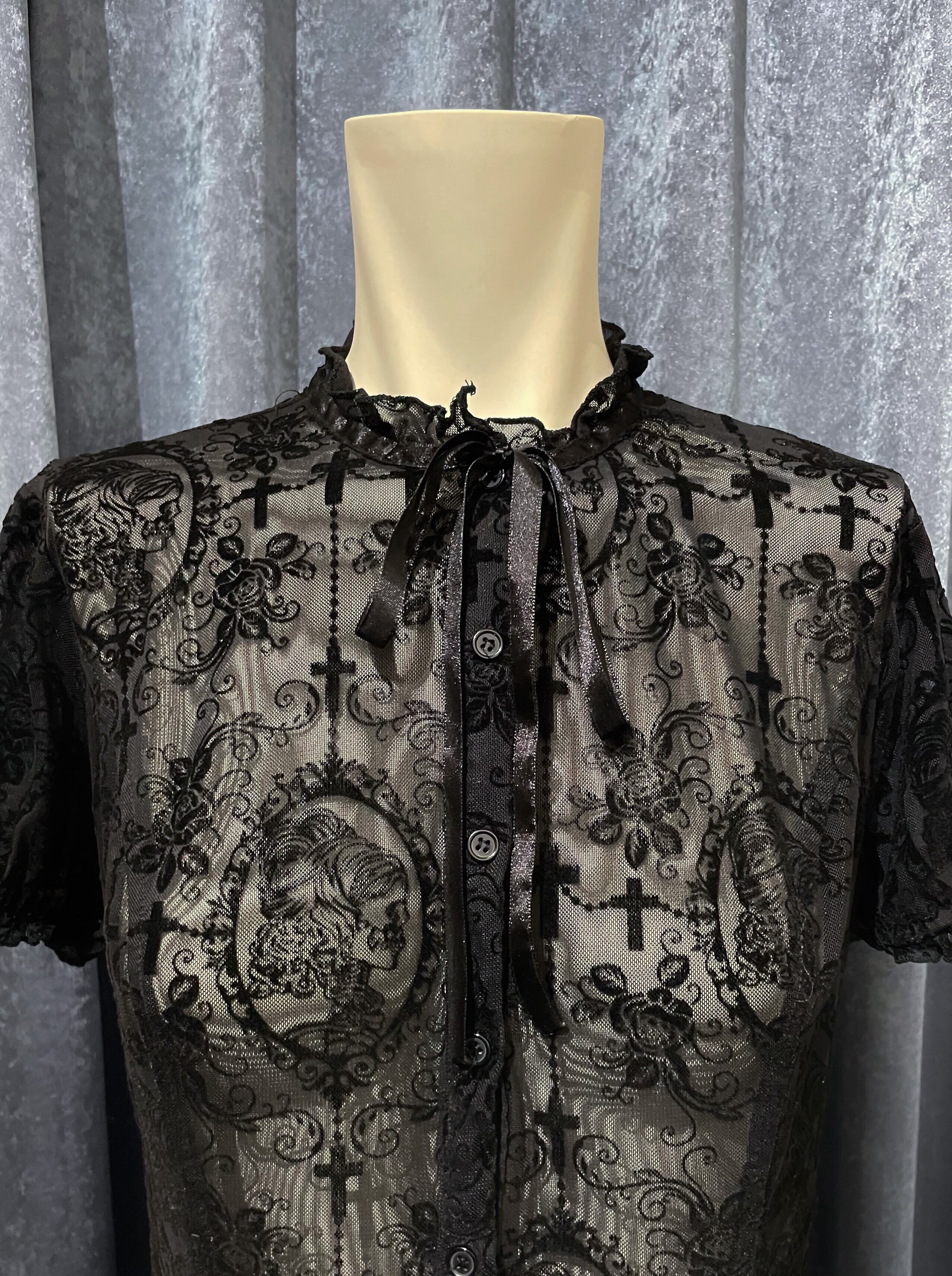 Antique Motif Ribbon Tie Frilled Neck Sheer Blouse