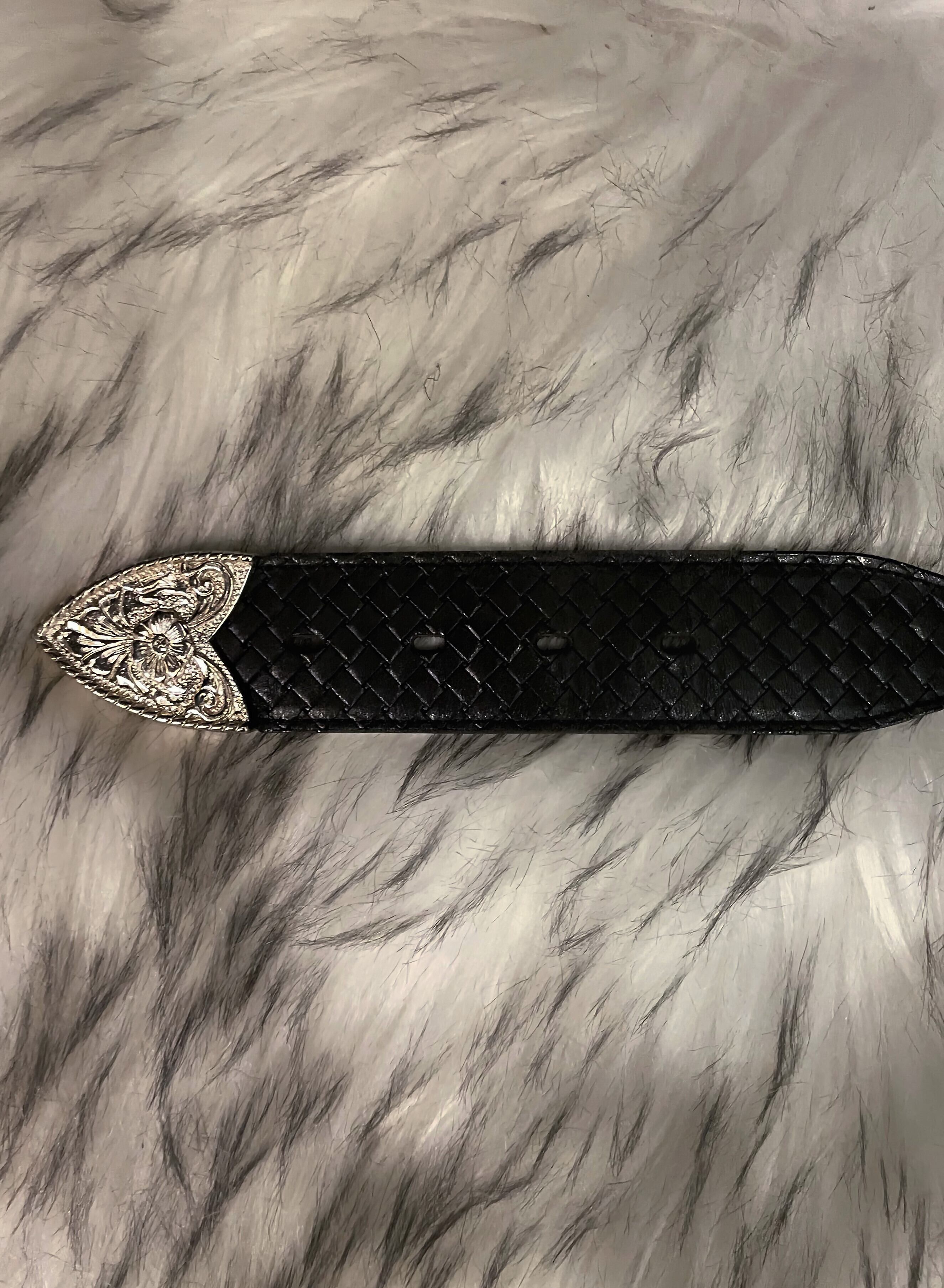 Western-Style Black Leather Belt with Ornate Silver Buckle